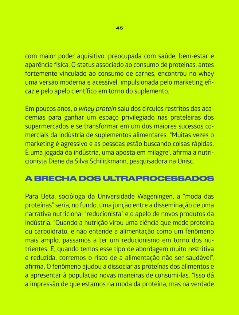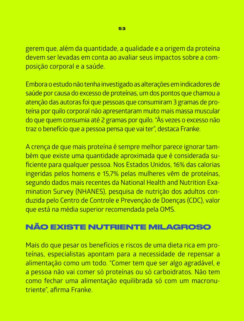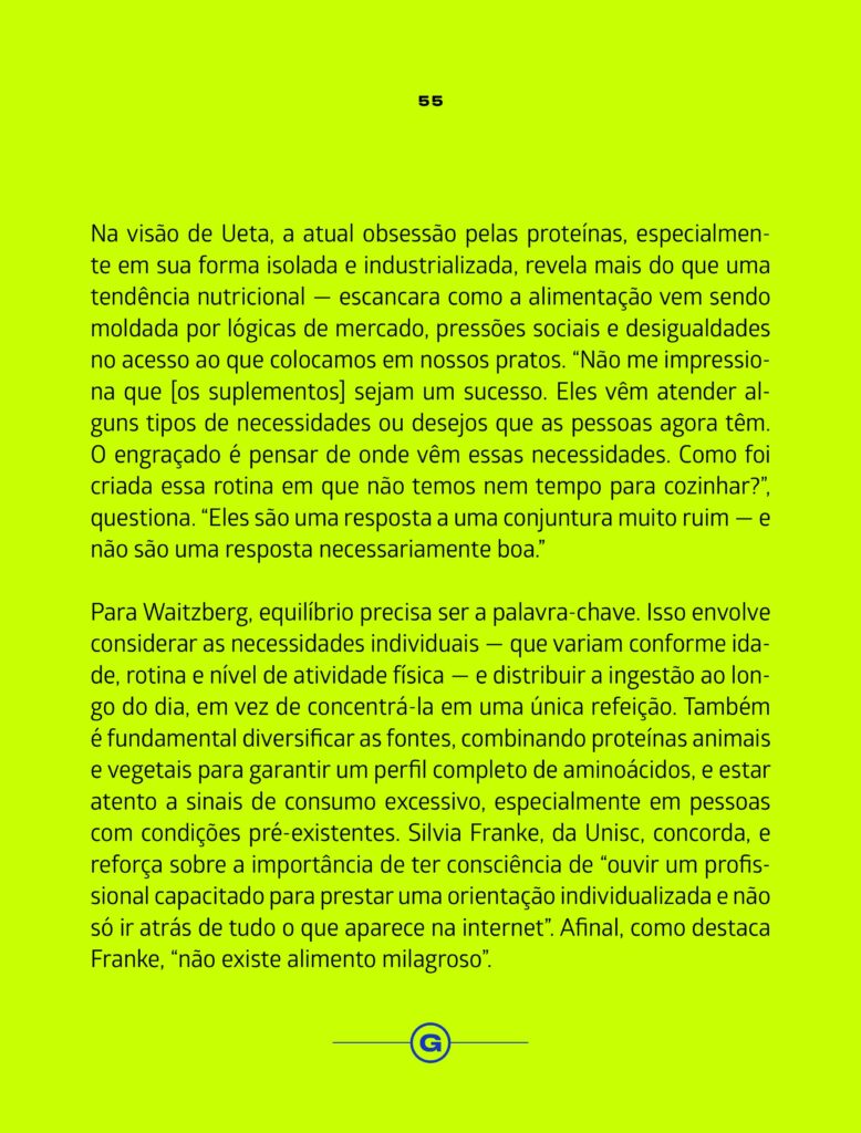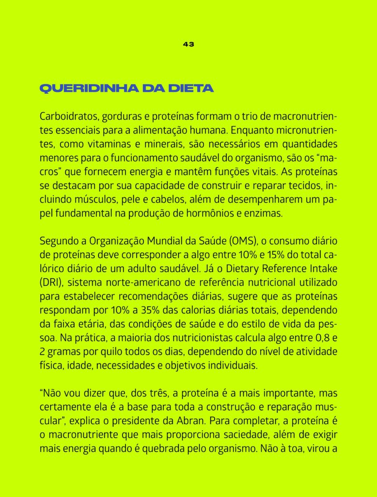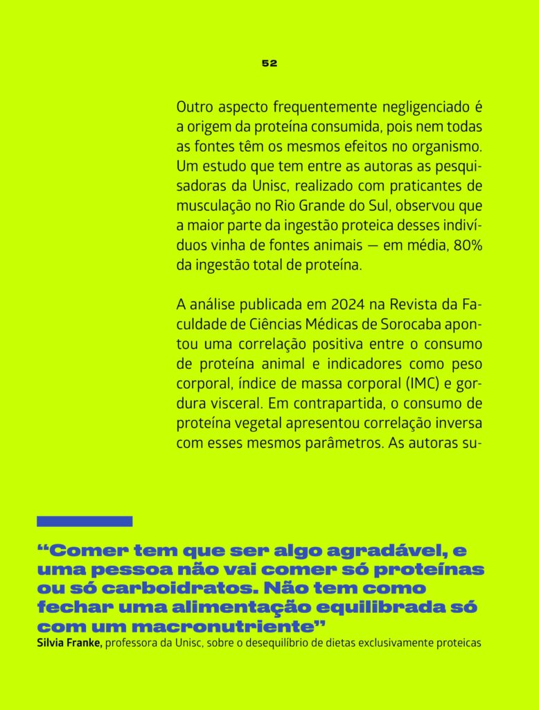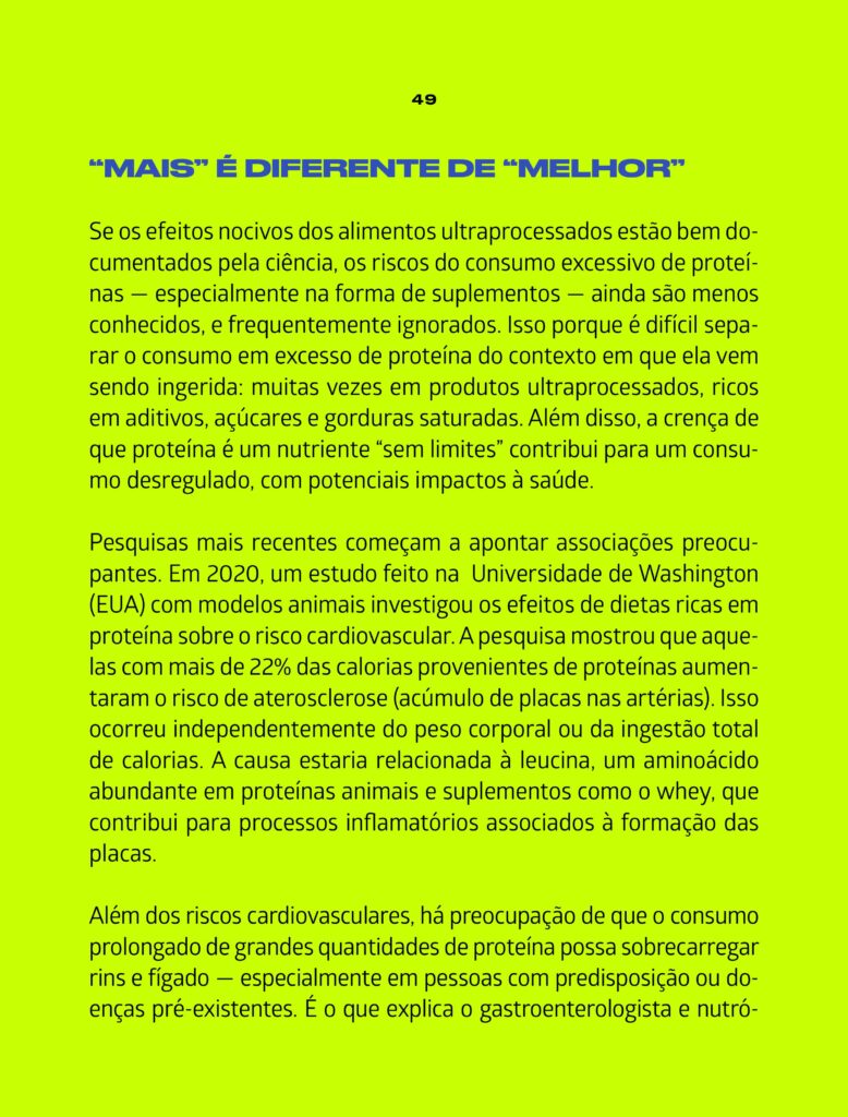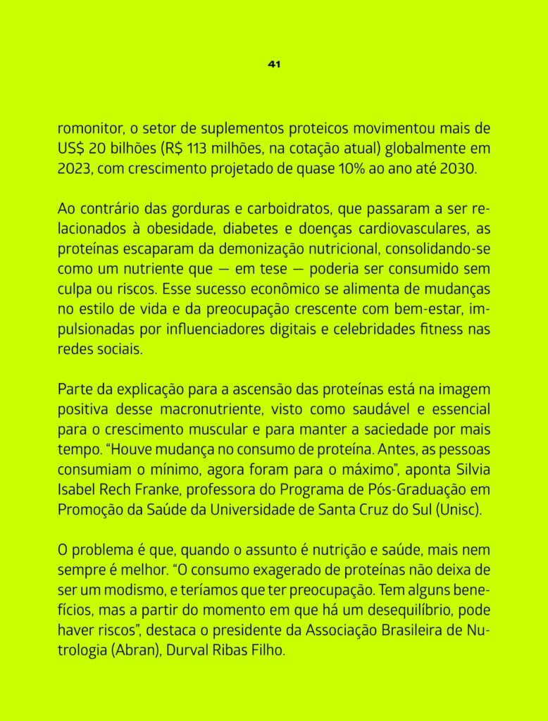 A Revista Galileu produziu uma matéria bastante interessante e com muitos detalhes sobre o consumo de proteína, benefícios e malefícios. O problema é que, quando o assunto é nutrição e saúde, mais nem sempre é melhor. “O consumo exagerado de proteínas não deixa de ser um modismo, e teríamos que ter preocupação. Tem alguns benefícios, mas a partir do momento em que há um desequilíbrio, pode haver riscos”, destaca o presidente da Associação Brasileira de Nutrologia (Abran), Durval Ribas Filho.